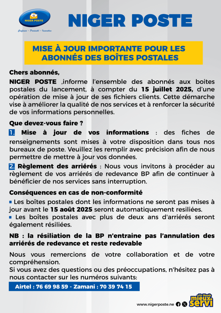 Dans le souci constant d’améliorer la qualité de ses services et de garantir la sécurité des données personnelles de ses clients, NIGER POSTE annonce le lancement d’une opération de mise à jour de son fichier client, destinée à tous les abonnés aux boîtes postales.