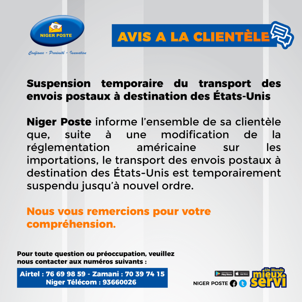 NIGER POSTE informe ses clients qu’en raison d’une récente modification de la réglementation américaine sur les importations, le transport des envois postaux à destination des États-Unis est temporairement suspendu jusqu’à nouvel ordre.
